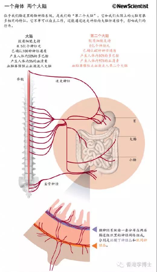 肠神经系统(enteric nervous system ENS)嵌在肠道壁上。科学家从很久以前就知道它能控制消化运动。但现在看来,它似乎也在我们的身体和精神健康方面扮演着相当重要的角色。它既可以独立工作,也可以跟你头顶的那个大脑通力合作。虽然你意识不到自己的肠道正在进行“思考”,但是肠神经系统确实可以帮助你察觉环境中的威胁,进而影响你作何反应。纽约市哥伦比亚长老会医疗中心(Columbia-Presbyterian Medical Center)的迈克尔·葛森(Michael Gershon)介绍说:“肠道向大脑发送的大量信息,都会影响我们的幸福感——我们甚至都意识不到。”
