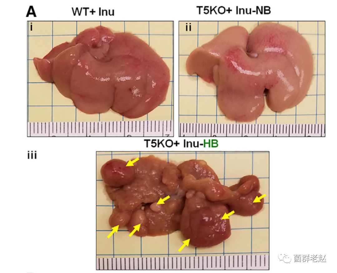 图4 T5KO免疫缺陷小鼠吃含单一菊粉的饲料会出现肝癌