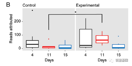 在第4、11、15天获取实验组与对照组的粪便样品,通过16S基因组测序检测其肠道微生物的组成。在整个实验过程中,对照组的肠道菌群几乎没有发生变化。然而实验组在做睡眠不足处理后,大鼠肠道菌群丰度有所降低。