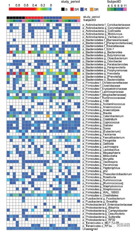 随后,为了探究对照组和实验组测序结果OTUs的分类(即肠道菌群的生物学分类)是否会受到睡眠不足的影响,研究人员做了热力图分析。