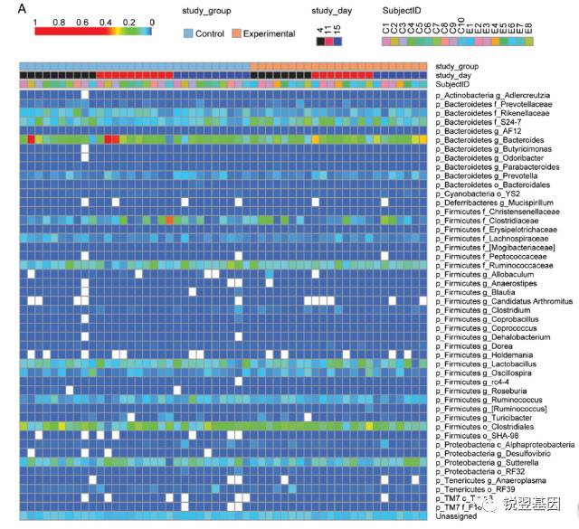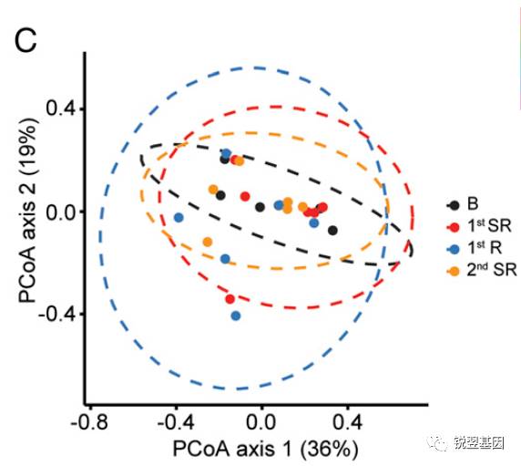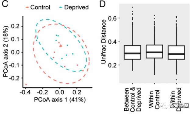 紧接着,研究人员研究了实验组与对照组肠道菌群之间的关联性以及其个体之间肠道菌群组成的变化情况。实验结果如下图所示: