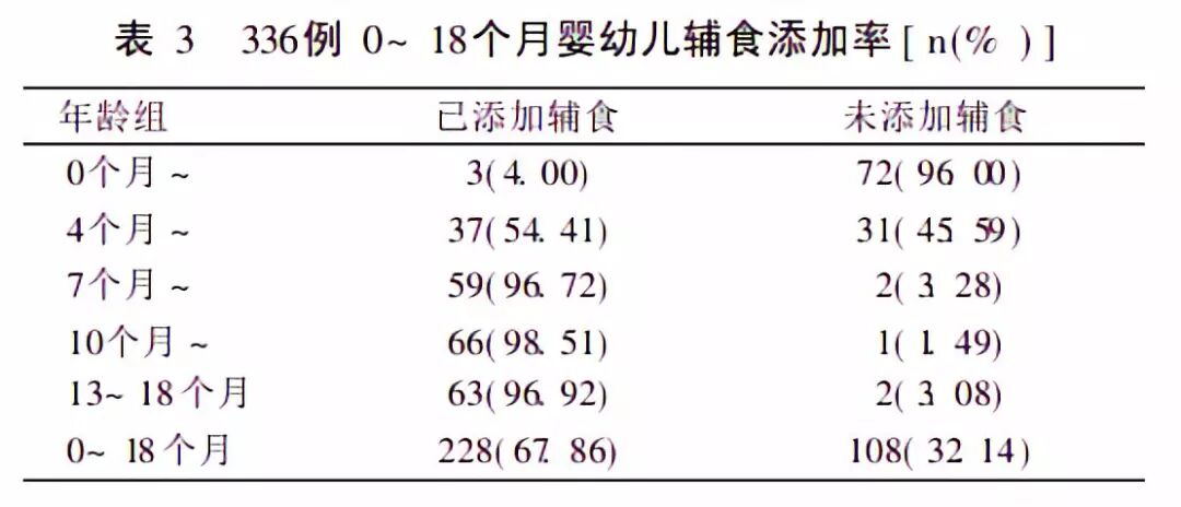4~6个月婴儿的辅食添加率不足 60% , 7个月后达 95%以上, 见表3。