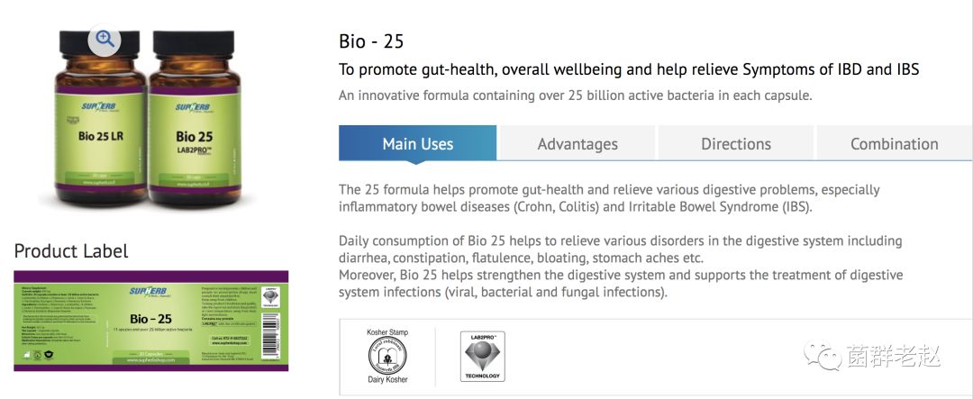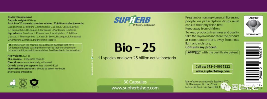 这个产品是一家以色列公司生产的,全名叫SupherbBio-25(图3)。从公司的网站上,可以看到该产品的介绍。据公司的说法,该产品含有11个不同的细菌,一天只需要吃一粒胶囊,每粒胶囊的活菌总数是250亿,声称对六大消化道健康问题具有很好的效果,包括:腹泻、肠道感染相关的疾病、消化问题、炎性肠病、肠应激综合征和乳糖不耐受。公司特别强调每个胶囊里的活菌数非常高,达到了250亿,该产品也因此得名。Bio-25里面的25是指25 billion,也就是英文的25个10亿,即250亿的意思。