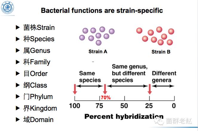 随着DNA分析技术的发展,细菌分类学家慢慢地开始用两个菌株之间的基因组DNA的相似性来进行“种”的划分。最后,大家终于达成一致,形成了如下的细菌划分“种”的标准:两个菌株之间的基因组DNA的相似性达到70%以上就被认为是“同一种”细菌;小于70%大于25%,被认为是同一个“属”里的不同“种”的细菌;小于25%就被认为是不同“属”的细菌。