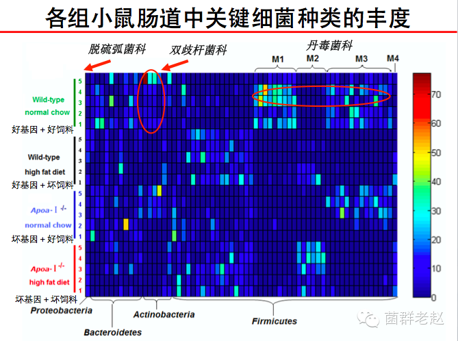 在这61个关键细菌里,还发现:双歧杆菌在饲喂高脂饲料6个月后,无论动物是什么基因型,都检测不到了。更有意思的是:脱硫弧菌科里有一个菌,在病得最重的“好基因+坏饲料”的组合里,丰度最高,是最健康的“好基因+好饲料”组合的7倍还要多。