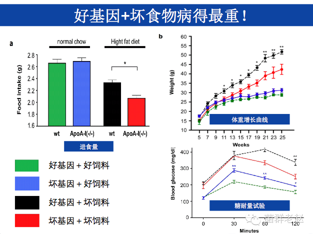张晨虹的DNA指纹图结果出来时,小韩那边的动物试验也收尾了。各组小鼠的体重和胰岛素抵抗(代表小鼠的早期糖尿病症状)的数据出来了。结果却出人意料:胖得最厉害、胰岛素抵抗最严重的组合居然是”好基因+坏饲料”!而原本大家感觉,“坏基因+坏饲料”那组的小鼠应该是病得最重的组合。再仔细分析进食量,“好基因+坏饲料”那组小鼠的食量,比“坏基因+坏饲料”组合要高出大约30%。试验结果表明:只要多吃高脂饲料,动物不需要有基因缺陷也可以得严重的肥胖症和胰岛素抵抗。