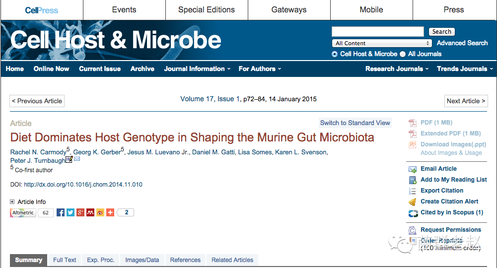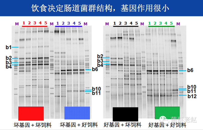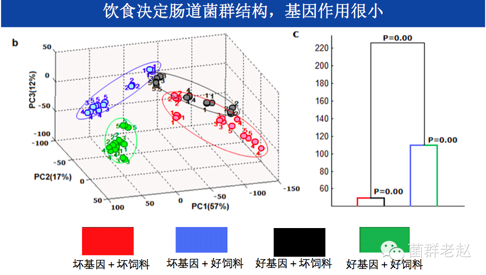 当然,老赵实验室的这项研究只做了一种基因和两种饲料配合对菌群和健康的影响。“饮食对肠道菌群的影响比基因更重要”的结论是不是有普遍意义,需要更多的基因类型与不同饮食进行组合的研究。