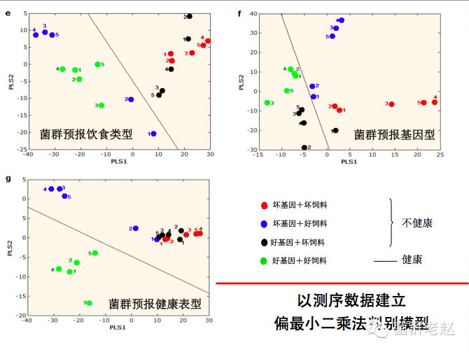 有了这个数据矩阵,张梦晖指导张晨虹,尝试着用各种多变量统计方法观察各组之间的差别。首先,用Rob Knight等人发明的UniFrac方法观察了数据的自然结构。结果显示,饮食的确是影响菌群结构的最重要的因素。然后,用PLS-DA进行分类建模,试着用菌群组成的数据预报一只小鼠吃什么饲料?有没有基因突变?是不是健康(有没有胰岛素抵抗)?经过留一交叉法检验,模型是可靠的,预报的准确率也比较高,然后又用一些统计方法把对分类贡献大的菌群种类挑选出来。我们用挑选出来的关键细菌种类的数据做同样的模型,结果与用516个变量的一样好,说明对分类真正有贡献的变量被挑出来了。这样,我们一共找到61种细菌,它们在饲料、基因或者健康状况发生变化时,会相应地改变自己在肠道里的丰度,而其他的细菌的变化则与我们感兴趣的这几个变量没有什么关联。这是一个数据降维、降噪的过程。也是从一片混沌的数据里找到有意义的规律的过程。
