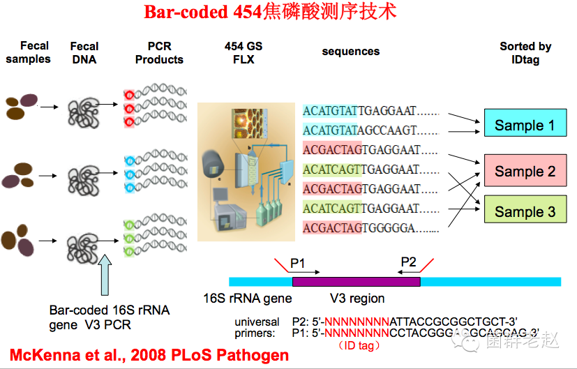 454测序技术是新一代测序技术的代表之一。这个技术一次可以测定几十万条序列,每个碱基的测定成本大幅度降低,一台机器的测序能力抵得上100台老一代的桑格测序仪。不过,要把这个方法用到菌群样品的测序,需要解决如何一次测定几百个样品还能把每条序列是从哪个样本来的分辨清楚的问题。