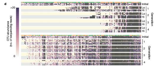 小鼠肠道内菌群丰度示意图。图中的点阵代表了不同的菌群分布。在正常饮食的小鼠(下图)体内,菌群的遗传相对稳定;而在长期摄入低纤维食物的小鼠(上图)体内,后代的肠道菌群丰度逐代降低。